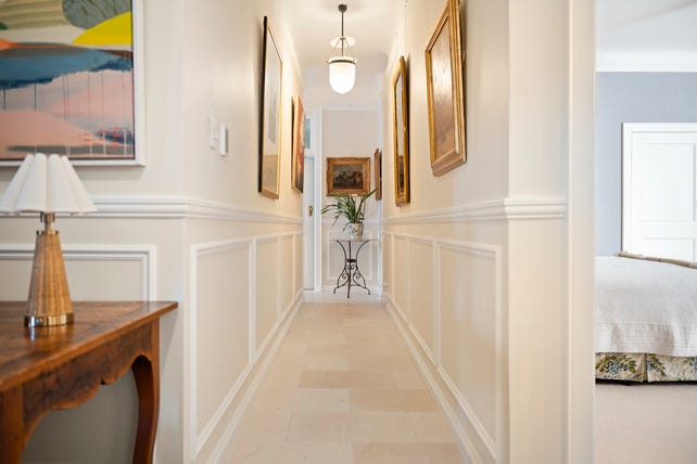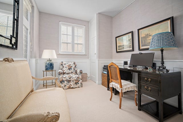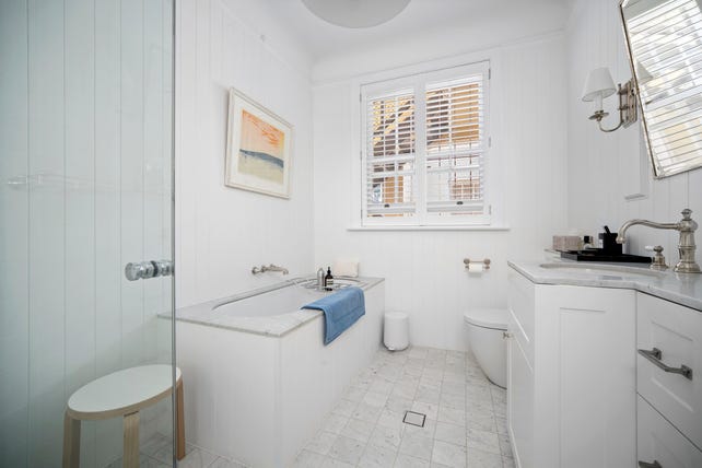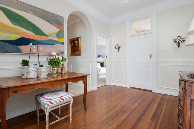- Plantation shutters, grand arched windows and timber floors